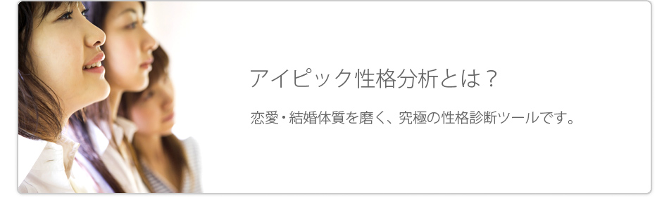 アイピック分析®(Angel Intelligent Personality Check)は、数々の性格分析法をミックスして成り立っています。例えば、交流分析(Transactional Analysis = TA)理論、エゴグラム分析、エニアグラム分析、社会心理学、行動理論などです。学術理論の採択につきましては、外部の性格診断の研究機関や専門家と共同で、定期的に見直しを行っています。アイピック分析®は、性格や価値観をあうお相手を紹介する 恋愛・結婚情報サービス エンジェル の相性マッチング技術に応用されています。